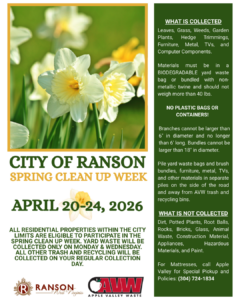 Spring Clean Up Week will take place April 20–24, 2026. Take advantage of this opportunity to clear out unwanted items and help keep our community clean and beautiful!
